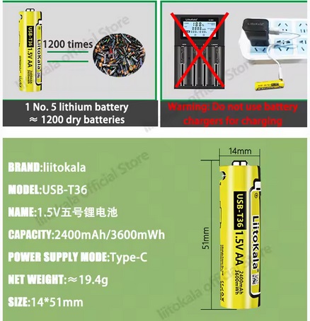 Akumulátor LiitoKala USB-T36 – 1.5V AA Lithium-Ion Baterie s USB nabíjením