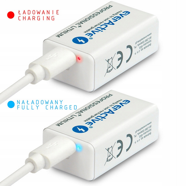 EverActive 6F22/9V – Dobíjecí Li‑ion baterie 7,4 V (550 mAh, micro USB-C, s ochranou)