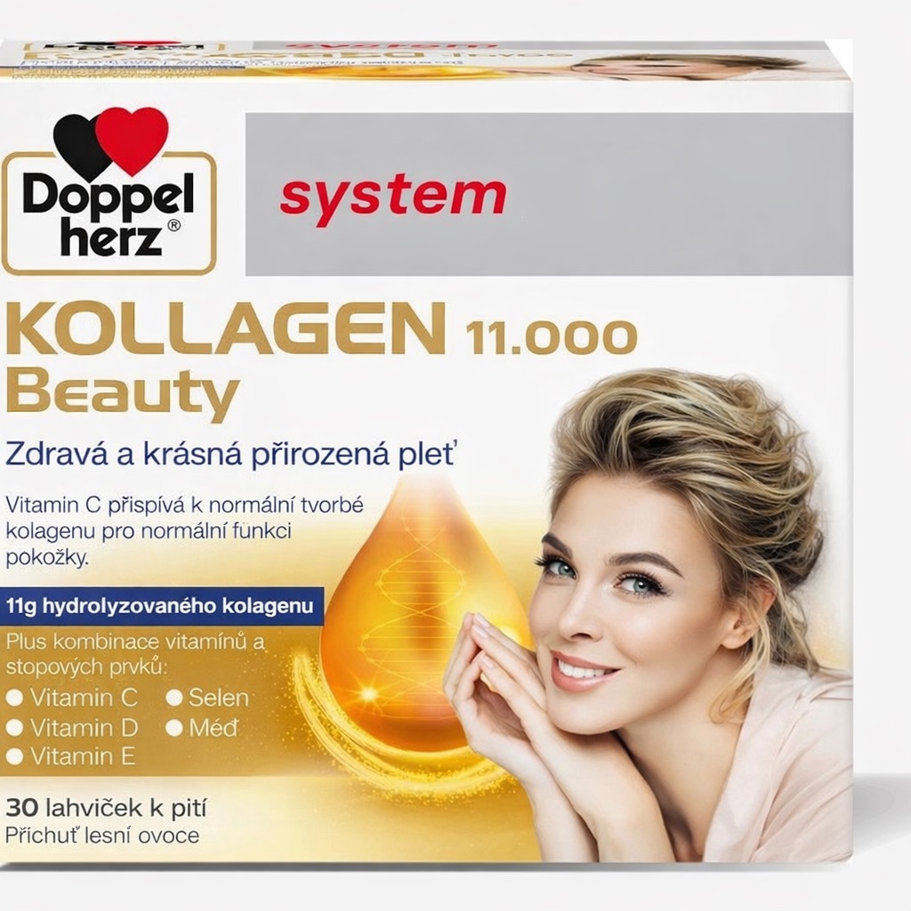 Doppelherz system Kolagen Krása 11.000 je prémiový doplněk stravy navržený pro podporu zdraví pokožky, vlasů a nehtů. Každá lahvička obsahuje 11 g hydrolyzátu kolagenu, který je klíčový pro udržení pevnosti a pružnosti pojivové tkáně.