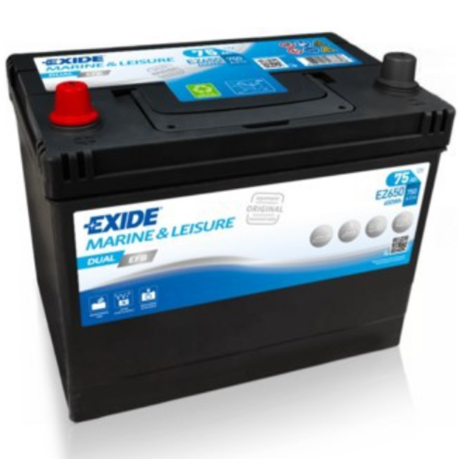 Baterie EXIDE DUAL EFB EZ650 je určena pro rekreační vozidla a lodě, které vyžadují jednu společnou baterii pro start motoru i napájení palubních spotřebičů. Nová řada DUAL EFB reaguje na rostoucí poptávku po moderních bateriích s vyšší cyklickou odolností a lepší akceptací nabíjení v segmentu Marine & Leisure.