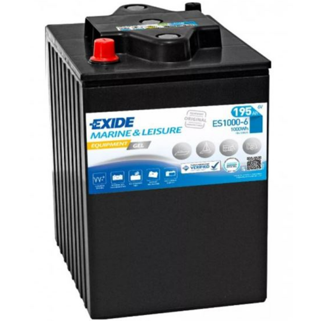 Baterie řady EXIDE EQUIPMENT GEL využívají slitinu Ca/Ca a VRLA ventily (ventilem řízené odvětrávání), díky čemuž jsou vhodné pro dlouhé období mimo provoz. Poskytují stabilní výkon v rozsahu 450–1300 Wh a jsou ideální pro napájení palubních spotřebičů, světel, čerpadel, elektroniky a dalšího vybavení, které vyžaduje dlouhodobý a spolehlivý odběr energie. Model ES1000‑6 je 6V varianta určená zejména pro systémy s vyšší kapacitou, často zapojovaná do série pro 12V nebo 24V sestavy.