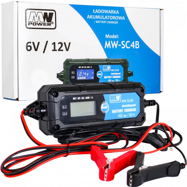 Elektronická inteligentní nabíječka MW‑SC4B je univerzální a bezpečné řešení pro nabíjení 6V a 12V olověných akumulátorů typu WET, GEL, AGM a MF. Díky mikroprocesorovému řízení, automatické detekci stavu baterie a vícefázovému nabíjecímu algoritmu zajišťuje rychlé, šetrné a maximálně efektivní nabíjení akumulátorů s kapacitou od 1,2 Ah do 120 Ah.
