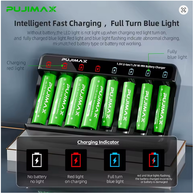 Rychlé a inteligentní nabíjení: Díky nízkému vnitřnímu odporu baterií probíhá nabíjení rychle. LED indikátor stavu vás informuje o procesu a po dokončení se zabarví do modra.