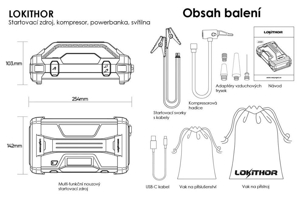 Lokithor JA302 PRO je multifunkční automobilový startovací zdroj se startovacím proudem až 1700A určený ke startování 12V vozidel (až 9-litrový benzínový motor nebo 7.5-litrový dieselový motor) během okamžiku. Kompaktní design kombinuje s tímto malým snadno přenosným boosterem i vzduchový kompresor, powerbanku a svítilnu. To vše s hmotností pouhých 1,9 kg díky lehké lithium-iontové baterii uvnitř. Jedná se tak o skvělého pomocníka při vašich dobrodružstvích, ať už jde o cestování, kempování, rybaření, lov nebo cyklistiku. Třeba v zimě na horách se už nemusíte bát, že byste kvůli oslabené autobaterii nenastartovali.