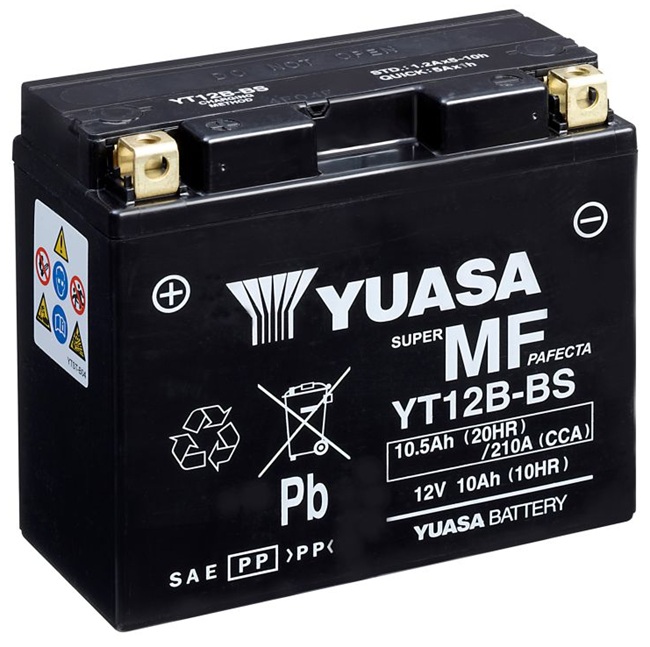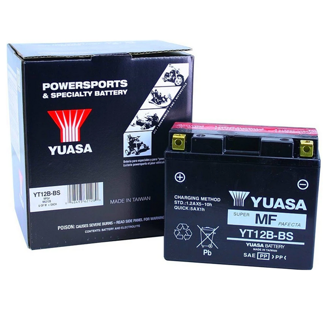 Motobaterie Yuasa YT12B‑BS z řady YTX®, YT & YTB Maintenance Free AGM je spolehlivá a výkonná baterie určená pro motocykly, skútry, čtyřkolky, zahradní techniku i vodní skútry. Díky technologii AGM (Absorbent Glass Mat) nabízí vysoký startovací výkon, dlouhou životnost a odolnost vůči vibracím i náročným provozním podmínkám. Po aktivaci je zcela bezúdržbová – elektrolyt je bezpečně vázaný ve skelném rounu a není třeba doplňovat vodu.