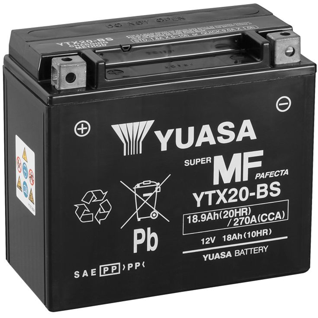 Motobaterie Yuasa YTX20‑BS z řady YTX®, YT & YTB Maintenance Free AGM je robustní, vysoce výkonná AGM baterie určená pro motocykly, čtyřkolky, skútry, zahradní techniku i vodní skútry. Díky technologii AGM (Absorbent Glass Mat) je elektrolyt bezpečně vázán ve skelném rounu, což zajišťuje stabilní výkon, bezpečné utěsnění a nulové riziko rozlití. Po aktivaci je baterie zcela bezúdržbová – není třeba doplňovat vodu a při běžném provozu vyžaduje pouze občasné dobíjení.