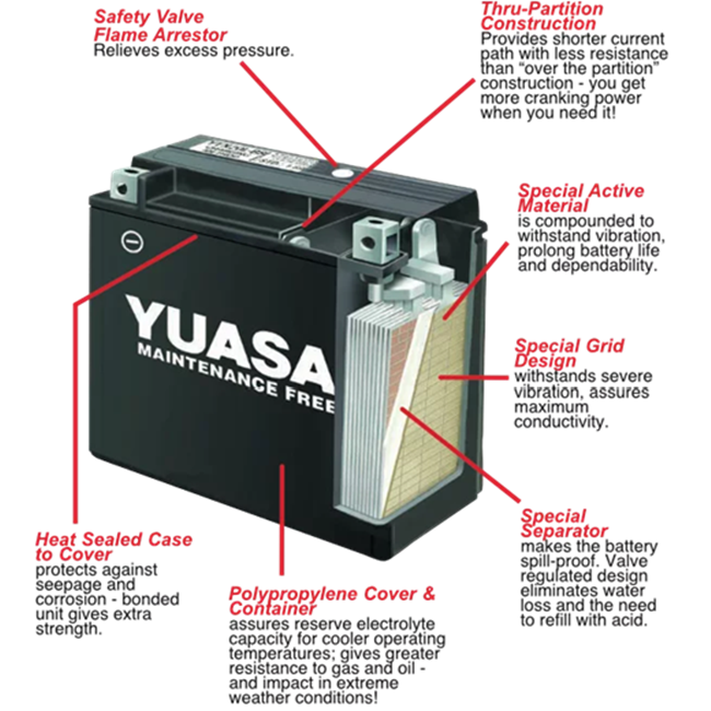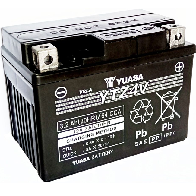 Motobaterie Yuasa YTZ4V z řady YTZ® High Performance Maintenance Free AGM je určena pro aplikace, kde je potřeba získat maximální výkon z minimálního prostoru a kde může být baterie instalována i v extrémních úhlech. Díky velmi kompaktním rozměrům, nízké hmotnosti a technologii AGM (Absorbent Glass Mat) poskytuje vyšší startovací výkon než standardní AGM baterie, a to i v náročných provozních podmínkách. Elektrolyt je bezpečně vázaný ve skelném rounu, takže baterie je po aktivaci zcela bezúdržbová a není třeba doplňovat vodu.
