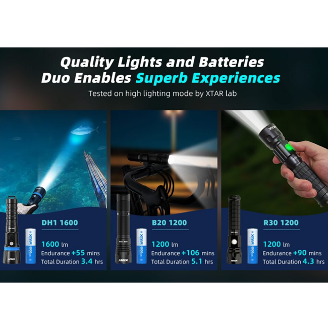 Xtar používá kvalitní Li‑ion články s vysokou energetickou hustotou a nízkým samovybíjením. Ochranný obvod prodlužuje životnost baterie a zajišťuje bezpečný provoz i v náročných podmínkách.