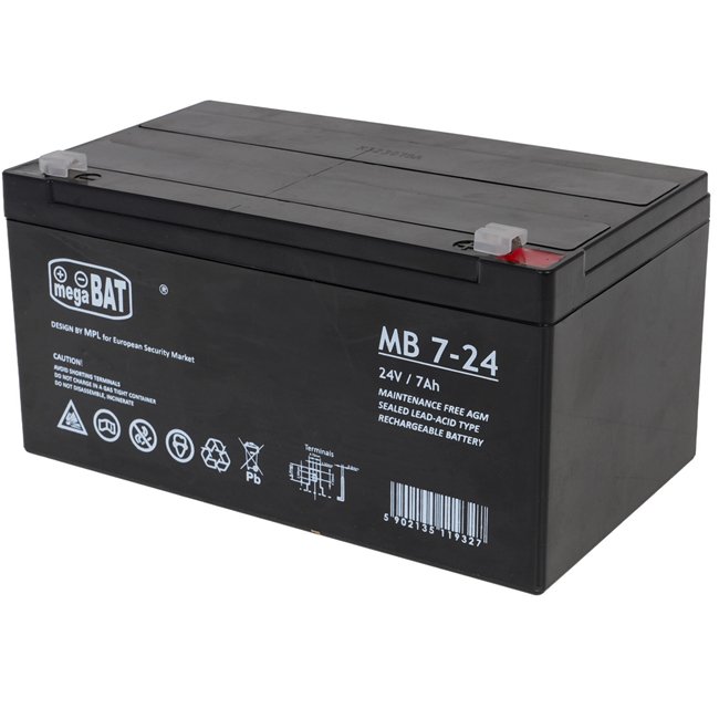 Bezúdržbový olověný akumulátor MB 7‑24 s napětím 24 V a kapacitou 7 Ah je spolehlivý zdroj energie určený především pro záložní (bufferový) provoz. Konstrukce VRLA AGM zajišťuje bezpečný provoz v interiéru, nízké samovybíjení a stabilní výkon i při dlouhodobém udržovacím nabíjení. Díky kompaktním rozměrům, nízké hmotnosti a vysoké spolehlivosti je vhodný pro napájení systémů ústředního topení, zabezpečovacích a poplachových systémů, přístupových systémů a dalších aplikací vyžadujících 24V záložní zdroj.