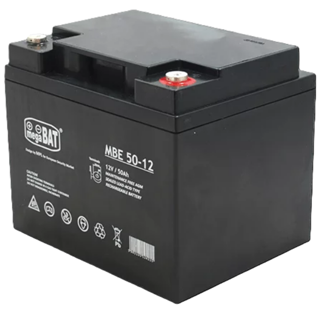 MEGABAT MBE 50‑12 – Nabíjecí olověná AGM baterie 12 V (50 Ah, pro záložní systémy / bufferový provoz)
