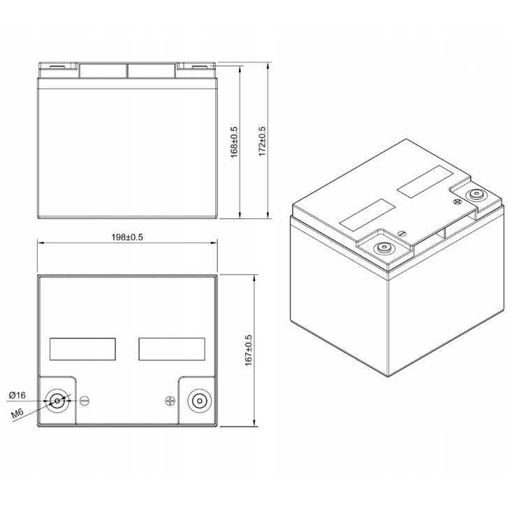 Akumulátor je navržen pro provoz v náročných podmínkách, zvládá teploty od –20 °C do +50 °C a díky Pb‑Ca multi‑alloy mřížce nabízí vysokou odolnost vůči korozi. Maximální vybíjecí proud 480 A (5 s) umožňuje krátkodobé napájení i energeticky náročných zařízení. Robustní konstrukce a kompaktní rozměry (198 × 167 × 172 mm) usnadňují instalaci do rozvaděčů, záložních zdrojů i mobilních systémů.